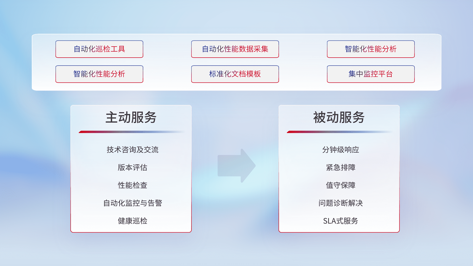 智能化工具和标准化文档,,保障服务质量,,提供主动服务(包含技术咨询、、版本评估、、性能检查、、自动化监控与告警、、健康巡检)和被动服务包含(分钟级响应、、、、紧急排障、、、值守保障、、问题诊断解决、、、、SLA服务)。。